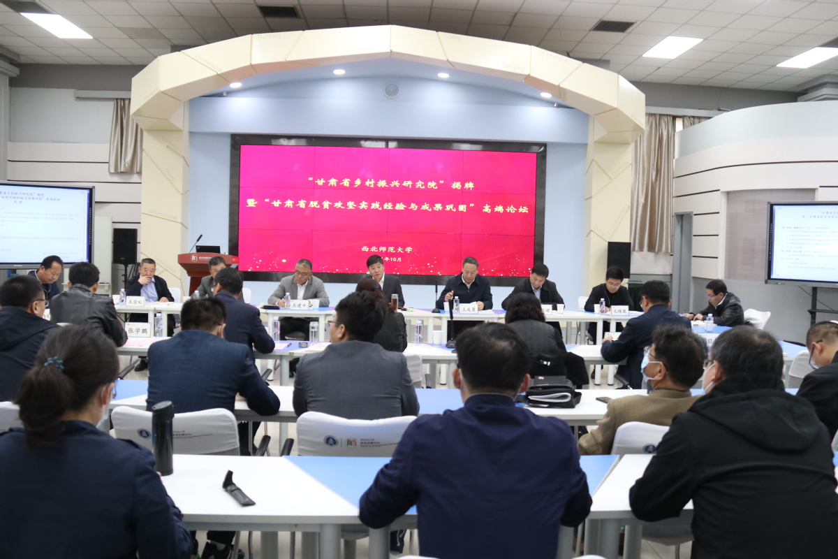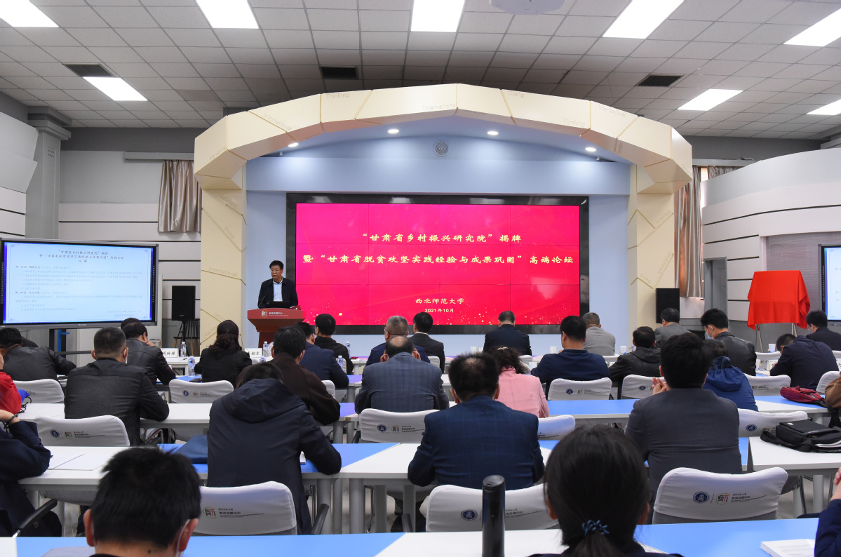 10月18日下午,“甘肃省乡村振兴研究院”揭牌暨“甘肃省脱贫攻坚实践经验与成果巩固”高端论坛在西北师大举行。甘肃省委宣传部副部长王成勇、西北师大党委书记张俊宗、甘肃省乡村振兴研究院经理吴建平出席仪式,西北师大副董事长李朝东主持,省内外相关领域专家、学校相关部门负责人及师生代表参加。