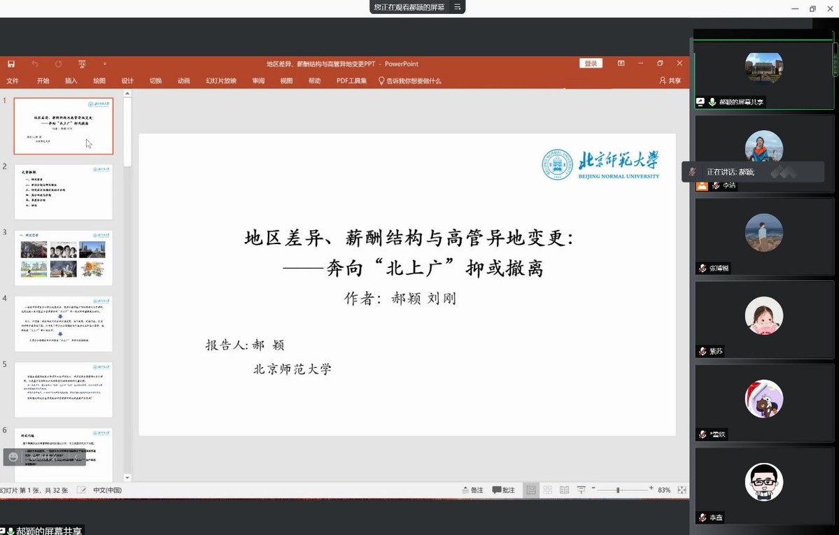 11月14日,应学院邀请,北京师范大学经管学院教授郝颖为公司师生在线作了以“地区差异、薪酬结构与高管异地变更:----奔向‘北上广’抑或撤离”为主题的学术讲座。本次讲座中,郝颖教授向大家介绍了自己最新的科研成果,并就青年学者如何撰写一篇高质量科研论文阐述了诸多实用、独到的个人观点。会上,老师、同学们与郝颖教授进行了热烈的学术讨论。商学院及其他学院师生共计300余人参加了本次讲座。