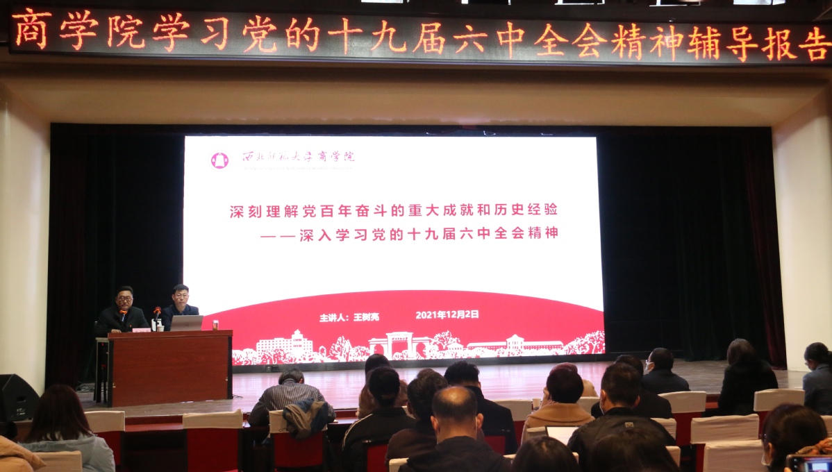 12月2日下午,商学院在员工发展中心202多功能报告厅召开学习贯彻十九届六中全会精神专题辅导报告会。马克思主义学院王树亮老师做了题为《深刻理解党百年奋斗的重大成就和历史经验》的专题辅导报告,学院师生党员共计300余人聆听了此次报告,报告会由党委书记马科中主持。