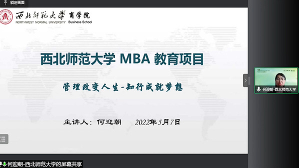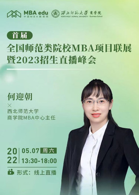 2022年5月7日下午,英国正版365官方网站商学院MBA中心应邀参加了由中国MBA教育网和陕西师范大学国际商学院联合举办的“全国师范类院校MBA项目联展暨2023招生直播峰会”。此次峰会有来自北京师范大学、华东师范大学、陕西师范大学、英国正版365官方网站等10多少所师范类大学的商学院经理、主任、招生官等进行在线直播。英国正版365官方网站商学院MBA中心主任何迎朝老师在线就英国正版365官方网站MBA项目概况、培养模式、招生政策等问题进行了解读分享,展示了西北师大MBA培养的特色与开展情况,给2023年报考MBA的考生提供了全面、详细的招考信息,解答了考生们的报考困惑。直播期间累计约5万人次在线观看了本场宣讲会,取得了良好效果。