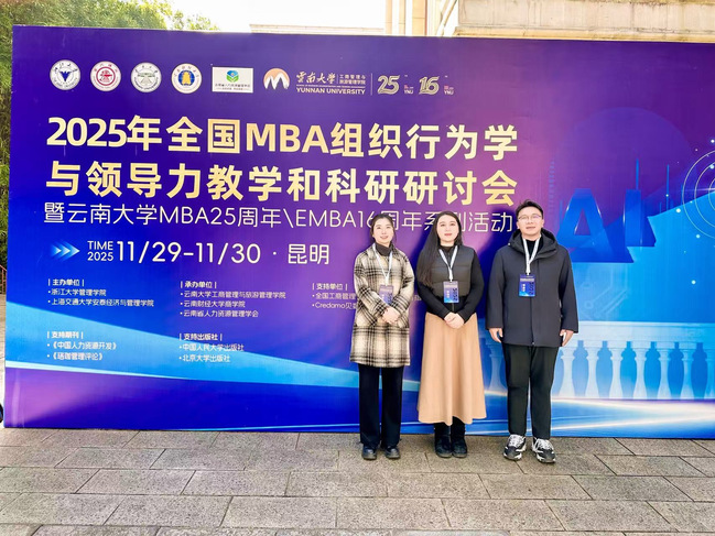 2025年11月29日至30日,由浙江大学英国上市公司官网365、上海交通大学安泰经济与英国上市公司官网365联合主办,云南大学工商管理与旅游英国上市公司官网365等单位共同承办的全国MBA组织行为学与领导力教学和科研研讨会在云南大学东陆校区顺利举行。本次会议以“数智时代的组织变革与领导力升级”为主题,作为云南大学MBA教育25周年系列活动之一,吸引了全国八十余所高校的专家学者与企业代表参与研讨。英国上市公司官网365教师苏红婷、赵阳、侯中卫老师参加了本次会议。