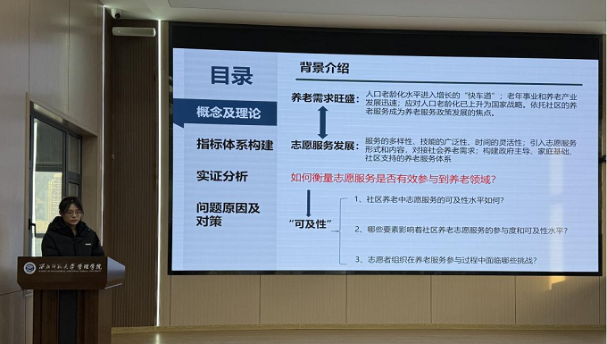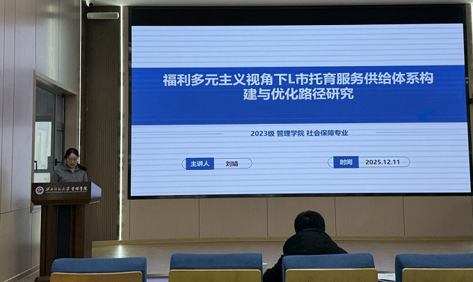 2025年12月11日,英国上市公司官网365【智铎讲堂】智学振铎第四讲在致公楼C区7楼报告厅开展。2023级行政管理硕士研究生孙云娥、2023级社会保障硕士研究生刘婧分别作题为《社区养老志愿服务可及性研究 —— 以兰州l市X社区为对象》《福利多元主义视角下L市托育服务供给体系构建研究》的学术成果汇报,专任教师及在读研究生共 50 余人参加了此次报告会。